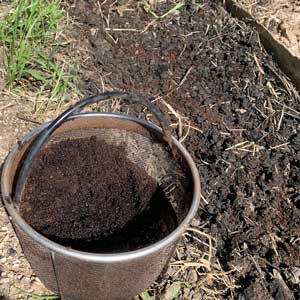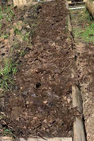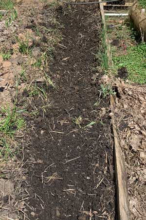 Though I ultimately hope to have a self-perpetuating garden, I still plant my onions using sets. My first step was to dig a shallow trench and remove the dirt from the previous year. I placed this dirt into my compost pile to be recycled and enhanced for the next year.